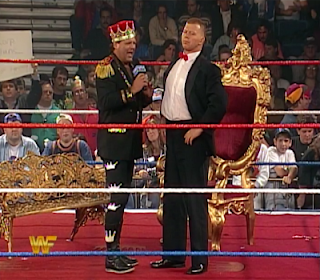 But opening our show is a "one on one Royal Rumble" between Mabel and King Kong Bundy. Ted Dibiase cuts a promo telling us the rules of the match. Simply throw the other over the top rope. Mabel tries to toss Bundy out early on, but no avail. Bundy lays some clubbing strikes then tries to toss Mabel out, but Mabel clutches the ropes. Mabel tries again on Bundy as the crowd is behind him, but still no luck. Bundy tries, but still fails. Bundy whips Mabel into the corner and lands an avalanche splash. He tries again at throwing Mabel over, but still no luck. Mabel gets a spin kick to the back of the head of Bundy. He tries an elbow drop, but misses. Bundy goes back to the ropes, trying to chuck out Mabel, but still no luck.