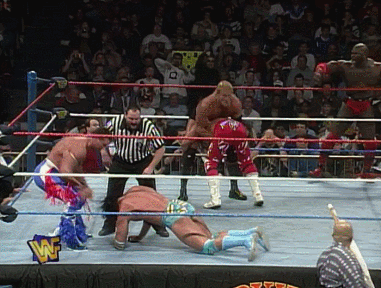 Bam Bam recovers with a back suplex. He goes for the falling headbutt, but misses. Goldust tries to hold him down, covering for two. Weird covering situation with Goldust writhing around Bam Bam. Chinlock Goldust, but Bam Bam turns it into an electric chair drop. Both men are down, but Goldust recovers first. He peppers in some strikes, but Bam Bam comes back. However, Goldust is quick to bounce back with a clothesline and knee drop. Chinlock again by Goldust, but another back suplex is what his fate entails. Several clotheslines and a cover only gets two for Bam Bam. Hard whip to the buckle by Bam Bam. He tries to go for a splash, but misses as Goldust lands a bulldog for the three.
